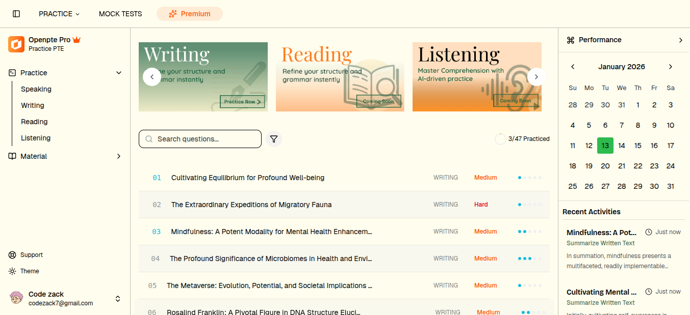 Is OpenPTE free?# Yes, for most users! You can practice a ton for free. But if you're a practice beast and keep smashing mock tests non-stop, you might hit the AI scoring or chat limit — that’s where Premium comes in to unlock unlimited everything.